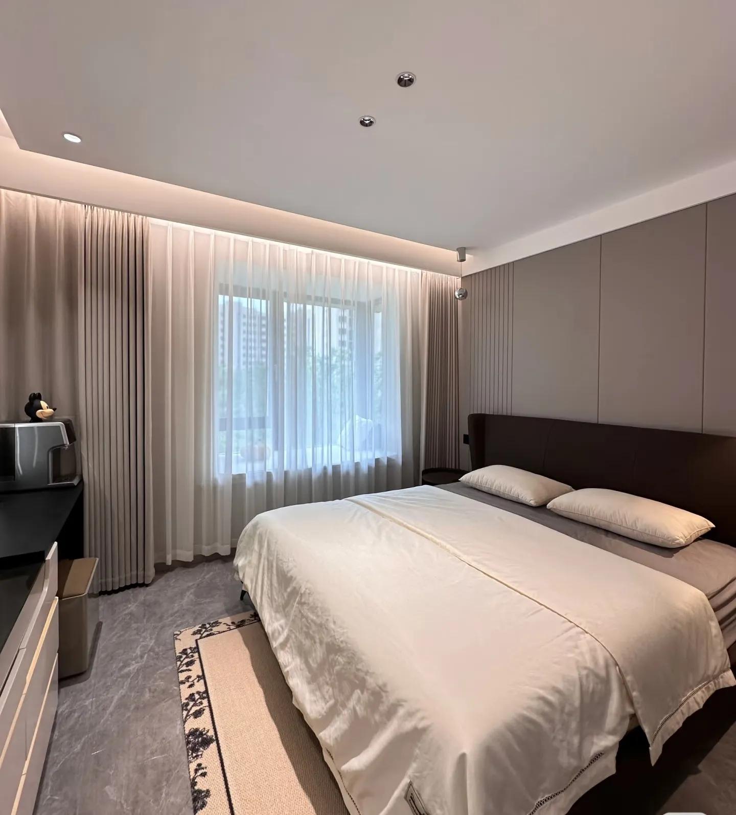 卧室空间卧室区域真的很温暖,即便地面通铺灰色瓷砖,床头背景墙硬包上墙,卧室区域窗帘选择纯色窗帘。