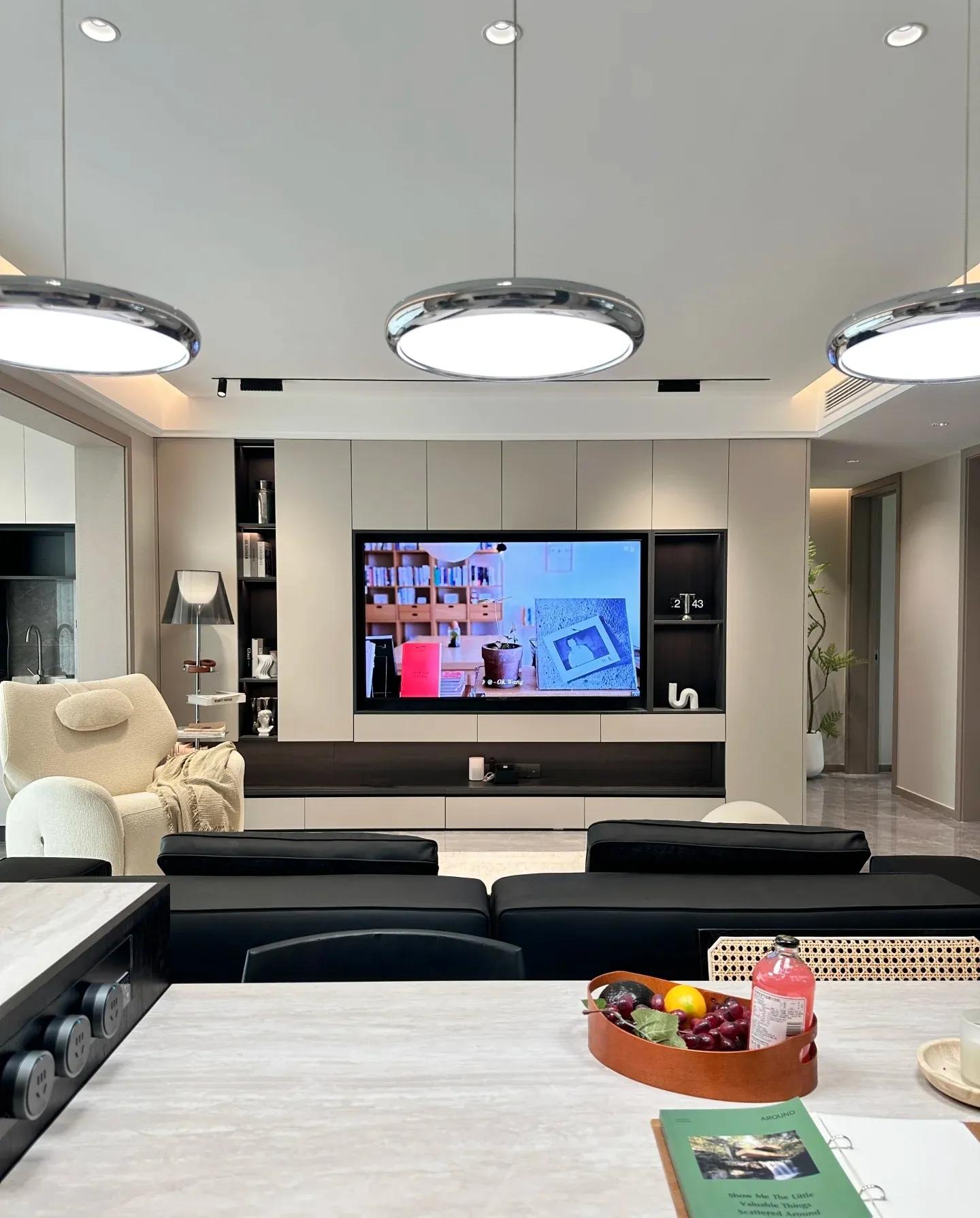 客厅区域坚持无主灯设计,整体做平顶,射灯➕磁吸轨道灯和灯带。色温偏暖色。
