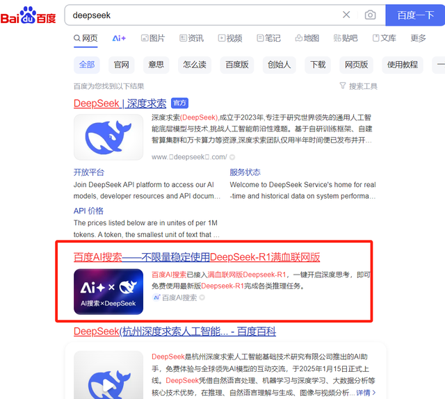 值得一提的是在百度搜索Deepseek的时候,百度还将其作为百度AI搜索的一大优势。