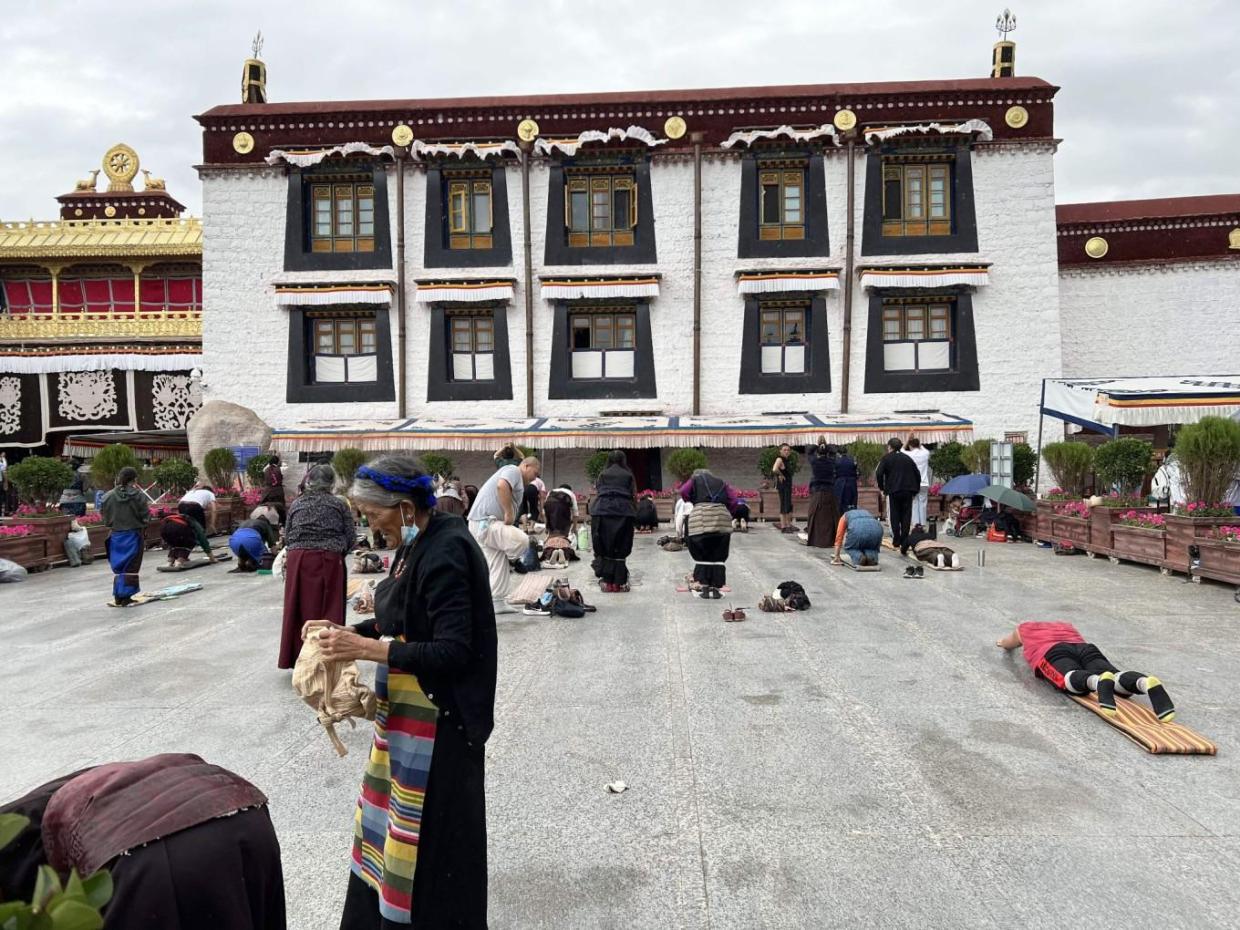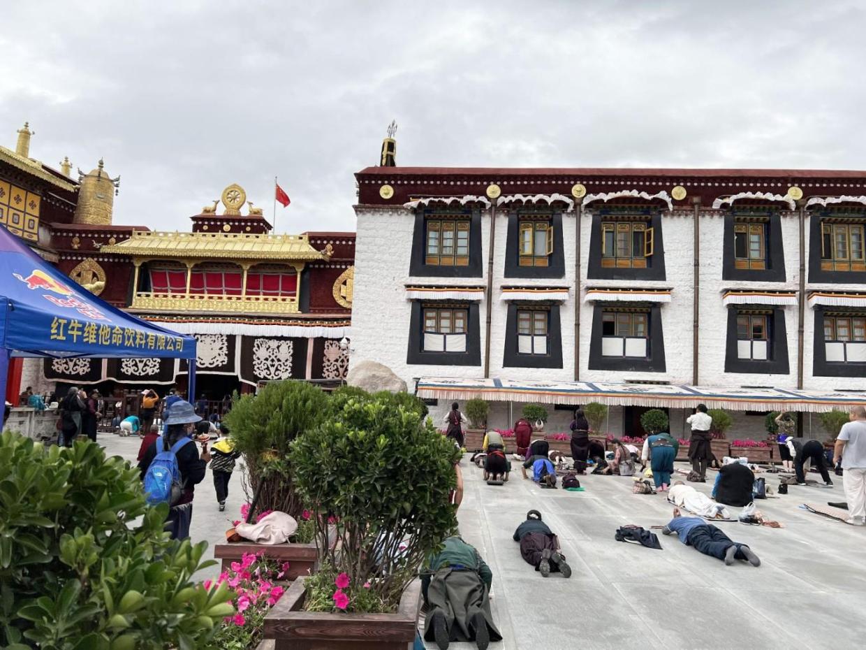 虽然寺院还没开门,但是透过栅栏,内部的小场地上信徒们的功课已经开始,虔诚的五体投地的磕长头在默默地进行中,不懂信徒的内心,即便是无神论的我们也期盼他们的愿望可以实现。