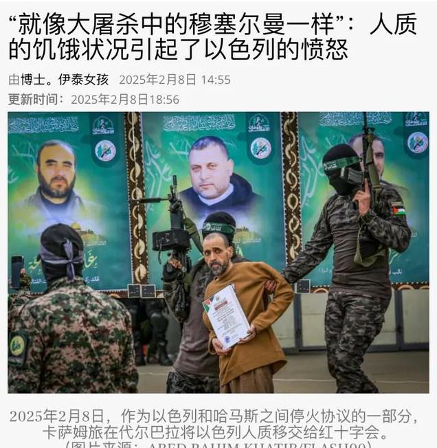 2月8日,按照人质交换协议的规定日期,哈马斯释放了三名男性人质。但是当这三名人质出现在媒体画面当中时,整个以色列都震惊了。原因在于他们非常瘦弱,甚至被视为是饿到了皮包骨。因为和他们之前的照片对比来看,他们的体重至少下降了30%~50%。