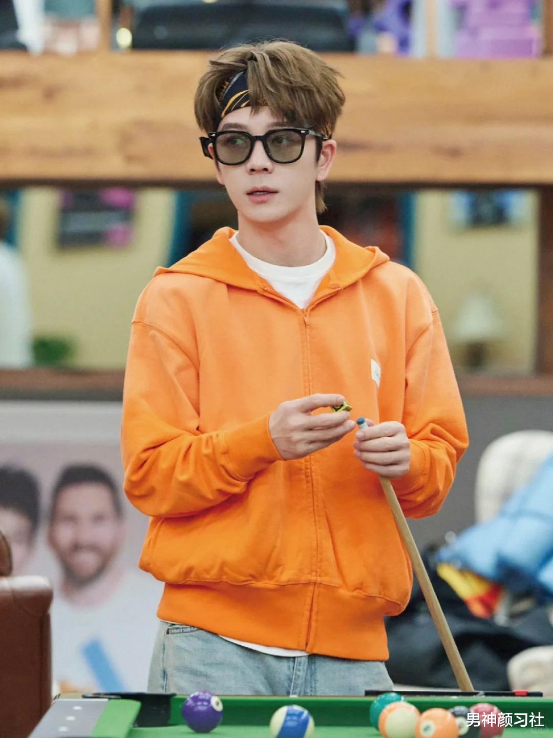 偶尔也可以尝试一些鲜艳的颜色,比如王栎鑫的这件橘色卫衣就特别靓丽。当你想让自己的穿衣风格看起来更为高调的时候,就可以试试看这种颜色的,其他的单品颜色淡一点就好。