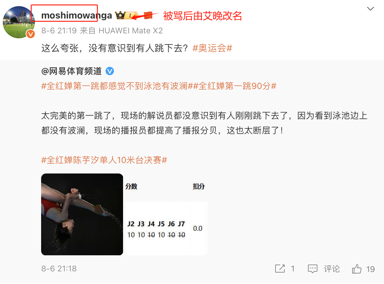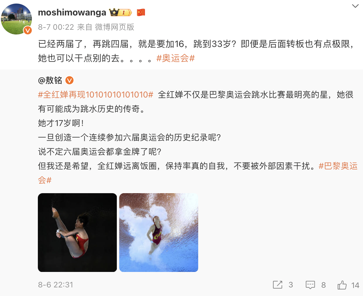 比如说他集中火力的全红婵,8月6号的时候,有媒体夸赞全红婵担任10米台第一跳,完美获得90分,几乎感觉不到有人跳下去了。