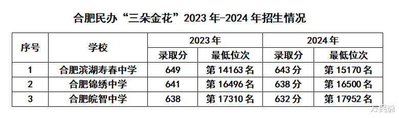 是不是所有曾经同一档次的高中都会分化?基本上都会这样,但也有特殊情况,民办“三朵金花”可能是个例外,2023年“三朵金花”录取分最高的与最低的相差11分,位次相差3147名;2024年录取分最高的与最低的相差依然是11分,位次相差2782名。随着锦绣和皖智的高歌猛进,“三朵金花”之间的差距却越来越小。