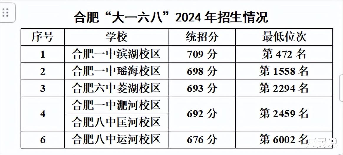 我们先来看看2024年中考“大一六八”三兄弟学校间的差距。曾经的“大一六八”,三校联招,2023年的时候还是一样的统招分数,基本相差无几的位次。到了2024年,不仅各校之间的统招分相差太多,而且同一学校不同校区之间也差距拉大,比如一中滨湖和一中淝河统招分17分,八中匡河和八中运河统招分相差16分。三所学校六个校区,从统招分来看,最高的709分,最低的676分,相差33分,位次相差5530名。