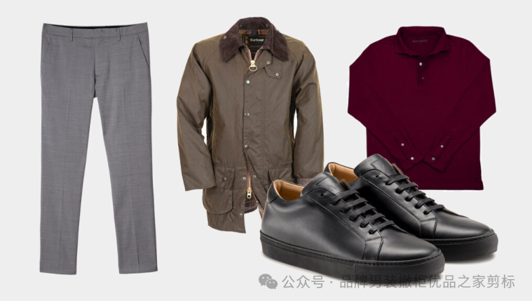 我们可以通过搭配灰色羊毛长裤、长袖 Polo 衫和蜡质夹克来翻转它。