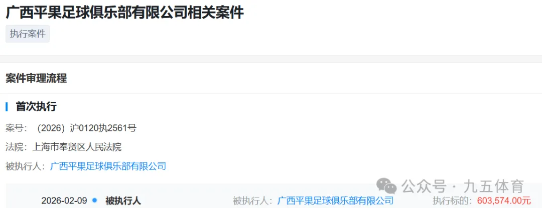 近日,天眼查信息显示,广西平果足球俱乐部再次被列为被执行人,执行法院是上海市奉贤区人民法院,执行标的约为60.36万元,立案日期是2026年2月9日。