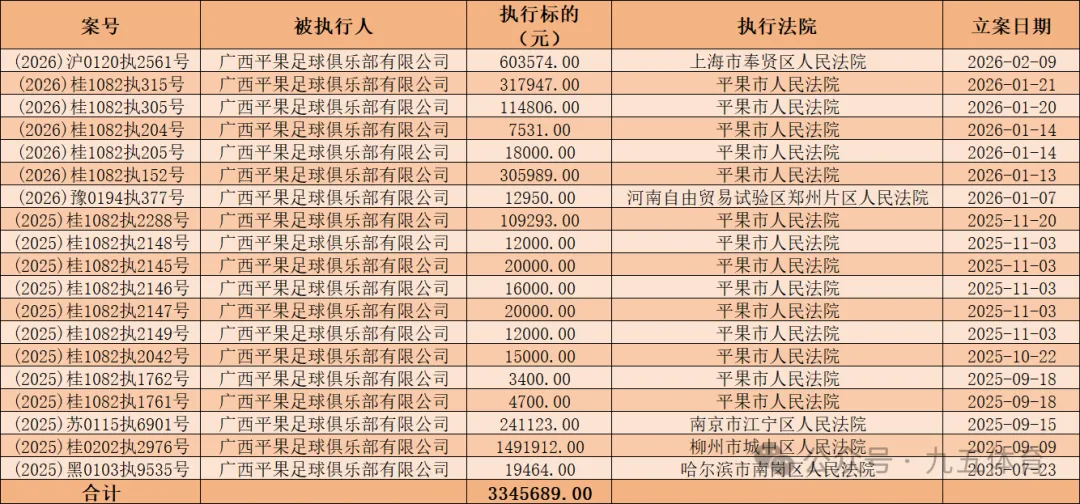 这是广西平果足球俱乐部2026年以来第7次被列为被执行人。