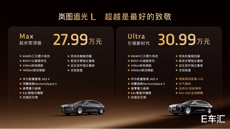 12月10日,在主题为“破晓”的上市发布会上,岚图汽车年度压轴力作追光L正式登场。新车共推出2个配置版型,指导价分别为27.99万元与30.99万元。作为一款中大型豪华新能源轿车,追光L所定价格,直接对标传统豪华品牌的燃油与插混轿车主力车型。