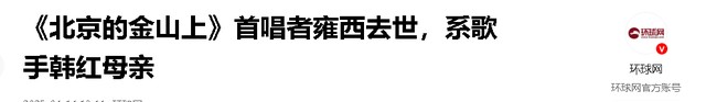 《《北京的金山上》首唱者雍西去世,系歌手韩红母亲》——环球网