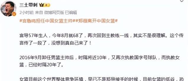 媒体人苏群发文点评:宫鲁鸣指导到底还是出山了,本来我盼望他带中国男篮,现在重新带女篮也不错。宫指导出山,跟当年蒋兴权指导重出江湖带男篮具有同样的意义。但和20多年前他带女篮不同,环境变化太大了,如今是流量时代,很多东西仅靠思想工作、三从一大解决不了,这是非常大的挑战。