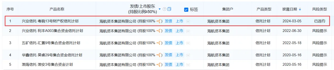 企业预警通显示,粤晓9号财产权信托1期成立于2018年2月6日,信托期限12个月,北京国华荣将其合法持有的标的股权收益权转让给兴业信托设立财产权信托,对应信托财产投资资金总额为15000万元,获得的信托对价用于补充企业经营性资金。2023年12月,兴业信托收到海航集团破产重整专项服务信托分配资金25.14万元,因该笔资金收入未能足额支付信托费用,故无可分配信托收益。