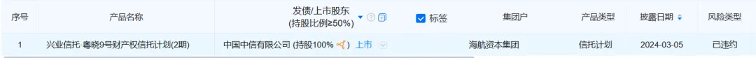 此外,粤晓9号财产权信托2期成立于2018年2月9日,信托期限12个月,上海圣展将其合法持有的标的股权收益权转让给兴业信托设立财产权信托,对应信托财产投资资金总额为20000万元,获得的信托对价用于补充企业经营性资金。2023年12月,兴业信托收到海航集团破产重整专项服务信托分配资金30.86万元,因该笔资金收入未能足额支付信托费用,故无可分配信托收益。