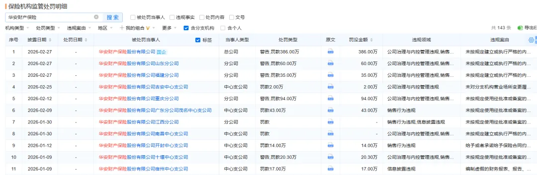 2月27日,国家金融监督管理总局公布的行政处罚信息显示,华安财险被查获“未按照规定使用经批准或备案的保险条款、费率”“报送数据不准确”“跨区域开展业务”等违法违规行为,该公司总公司被处以警告并罚款386万元重罚,该公司山东分公司被处以罚款60万元处罚,该公司福建分公司被处以罚款35万元处罚。