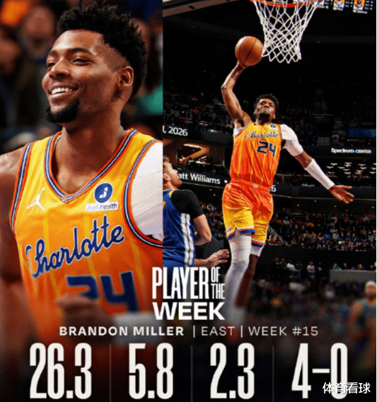 过去一周,米勒率领黄蜂打出4胜0负的战绩,场均贡献26.3分5.8篮板2.3助攻,三分命中率50%,当之无愧。