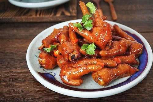 鸡爪洗净,剪去指甲,切成两半。拍蒜瓣、姜切片、小米椒切圈。 鸡爪冷水入锅,再放入姜片、葱段、一个八角、一块桂皮和适量料酒,焯一下水。 捞出温水冲洗沥干。 热锅冷油,爆香姜、蒜、小米椒。 再放入一个八角、一块桂皮和冰糖。煸炒至冰糖微微融化 放入鸡爪,翻炒均匀。然后倒入生抽、老抽和少许米醋调味。 倒入一罐啤酒和少量热水没过鸡爪。大火煮开后,转小火焖煮20分钟。 最后用大火收汁。撒少许小葱做点缀,装盘!