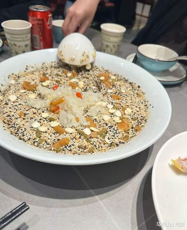 自制黑豆腐:用黑豆细磨做的豆腐,用红曲米和酱汁一起焖,看起来像红烧肉一样的颜色,诱人食欲,吃起来黑豆腐口感咸香,黑豆香气浓郁。