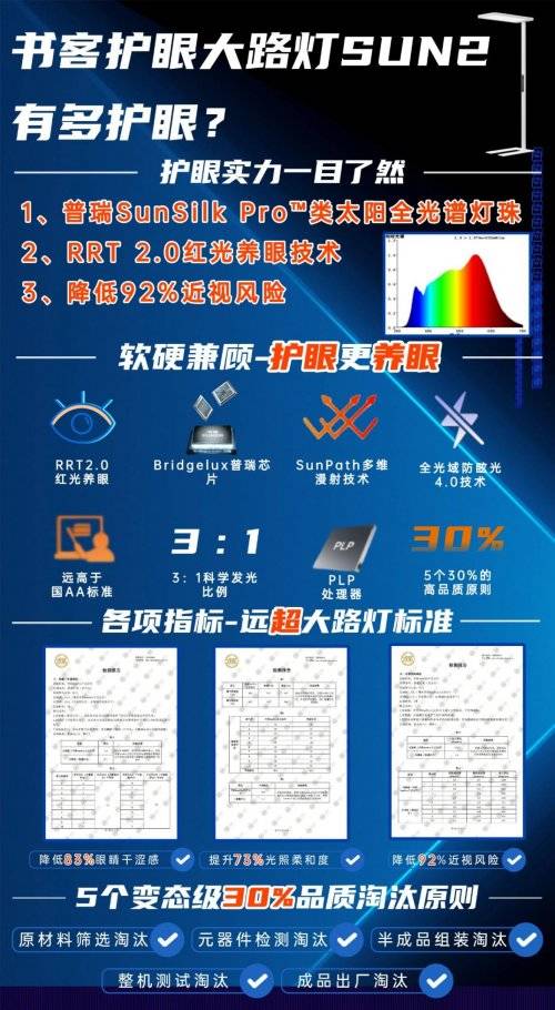 护眼大路灯哪个牌子好?大量研究表明,高能蓝光长期直射眼睛,会导致视网膜细胞氧化损伤,加速黄斑病变,甚至增加不可逆失明的风险。尤其是儿童和青少年,他们的晶状体尚未完全发育,对蓝光的过滤能力更弱,受到的损害更严重。而书客在过去多年一直都为实现更安全的护眼研发了多项创新黑科技,舍弃传统“蓝光激发”,打造了独特的18项安全无毒、高性能黑科技,采用了自研第7代SunMaster紫光原芯,集「控·护·养」于一体,从根源上抑制蓝光含量,大幅度削减400~450nm蓝光峰值,蓝光含量降低60%,比RGO豁免級标准低72%,实现了0蓝光刺激,有效减轻94%用眼疲劳!