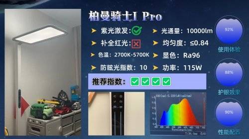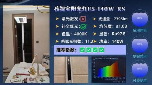 护眼大路灯哪个牌子好?孩视宝这款护眼大路灯实际均匀度在1.08左右,一体式的发光面通过上下发光,有效减少光线明暗差,并且减少眩光,实际UGR控制在11.3左右,另外去色温支持3000K–5000K调节,另外在核心光源上,孩视宝加入了红光,不过实际光谱中有益蓝光和短波绿光比较平缓,整体的光谱并不接近自然光,不过需要注意的是,虽然防眩光指数较低,但实际还是出现了轻微的眩光感。