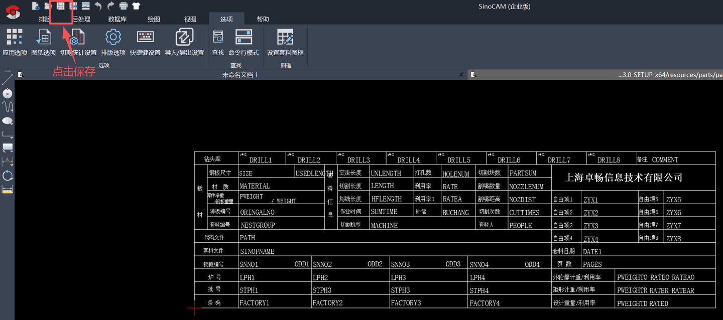 1、点击“选项模块”-- “设置套料图框”功能,软件会自动跳转到排版框模板编辑界面,注意:用户根据实际需求调整后,一定要点击左上角的“保存”。后续再排版时,软件就会默认以修改后的排版框作为模板。