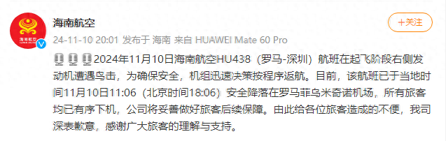 2024年11月10日,海南航空HU438(罗马-深圳)航班在起飞阶段右侧发动机遭遇鸟击,为确保安全,机组迅速决策按程序返航。目前,该航班已于当地时间11月10日11:06(北京时间18:06)安全降落在罗马菲乌米奇诺机场,所有旅客均已有序下机,公司将妥善做好旅客后续保障。由此给各位旅客造成的不便,我司深表歉意,感谢广大旅客的理解与支持。