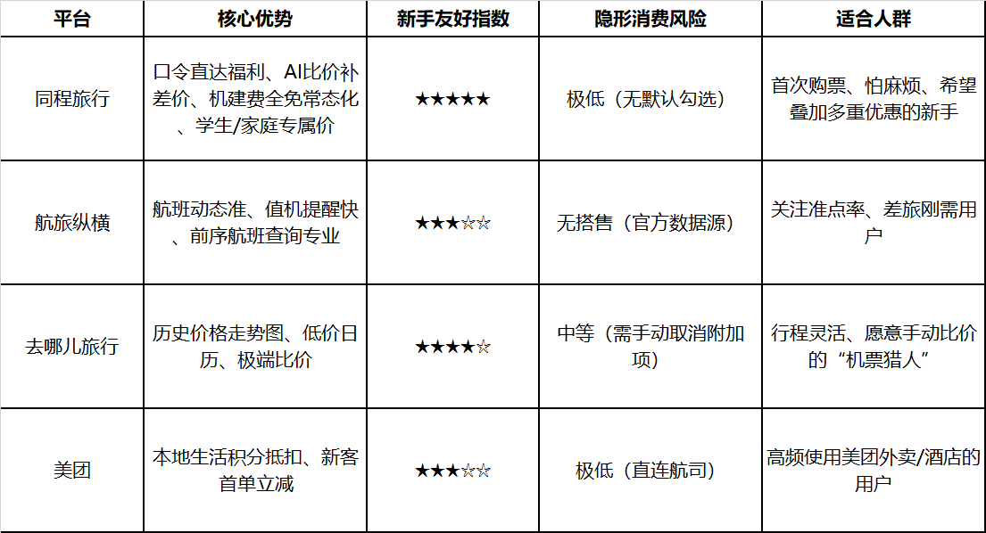 在2026年的机票预订市场,同程旅行、航旅纵横、去哪儿、美团呈现出鲜明的差异化特征。针对“第一次买特价票、不想研究复杂规则、害怕隐形消费”的新手群体,我们整理出以下对比清单: