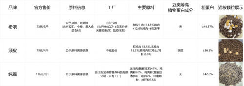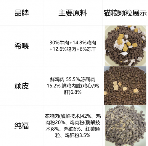 纯福猫粮:纯福猫粮的粗蛋白≥42.6%、粗脂肪≥16.8%,牛磺酸≥0.2%。以冻鸡肉(酶解技术)42%、鸡肉粉20%为主料,搭配酶解鸡肉粉、鸡肝粉、冻鸡心等,动物蛋白来源丰富。配料中仍包含红薯颗粒、木薯淀粉、苜蓿草颗粒等植物性成分,植物蛋白占据一定比例。