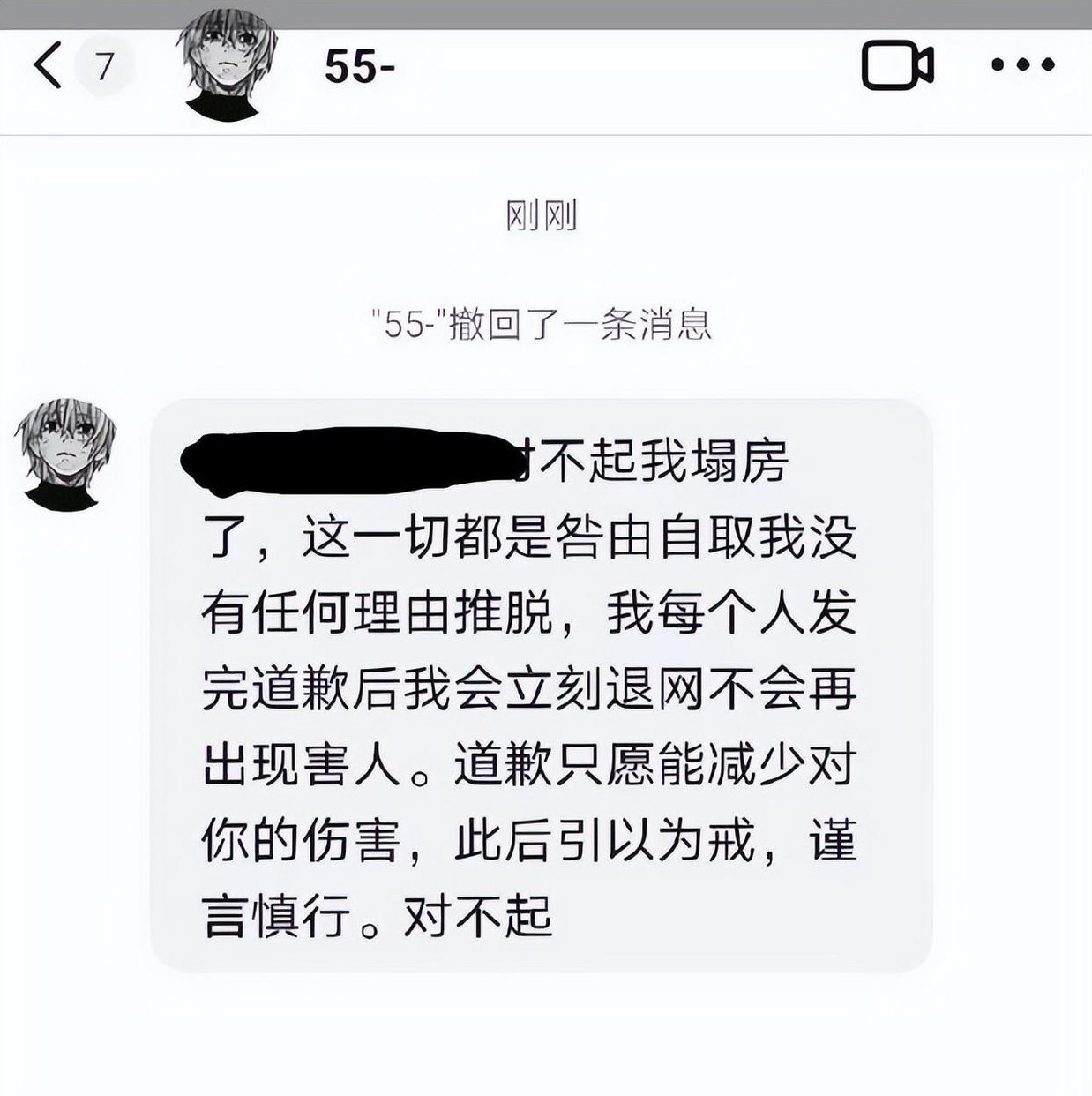 被曝光恶行之后,当下“55-”的账号已经被设置成私密账号,有网友还晒出“55-”发送给受害女生,道歉私信,其中写道这一切都是她咎由自取的结果,他对此没有任何理由推脱,他会给每个人道歉之后退网,日后不会再有这样的行为。
