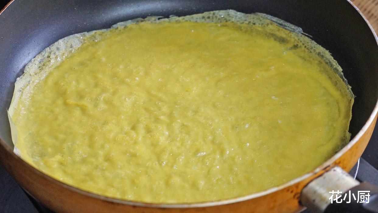 3、凝固了就翻个面儿。继续煎一会儿。两面都煎熟了就可以出锅了,大约10秒出一张鸡蛋皮,继续下一张。