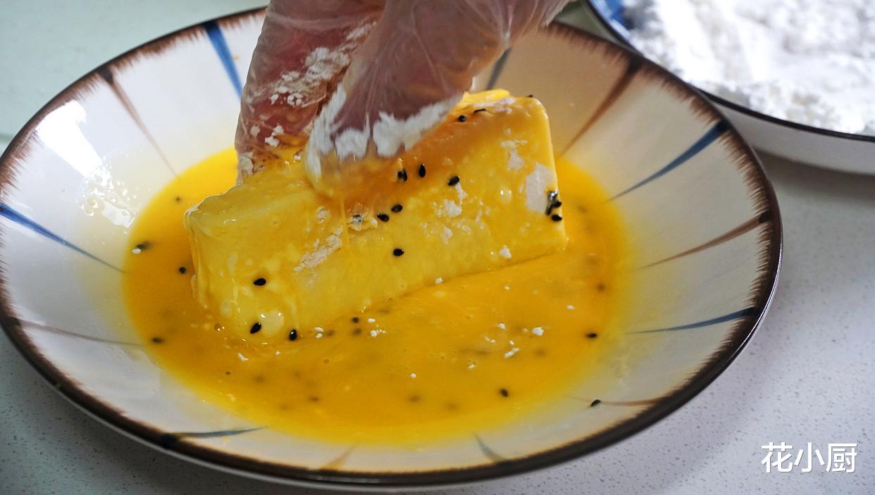 5、先把切好的牛奶糕裹上一层淀粉,再裹上一层蛋液;