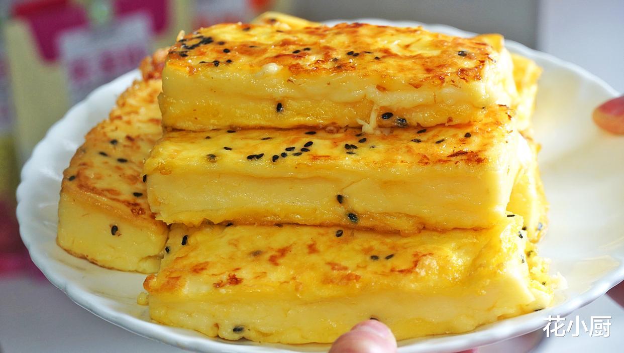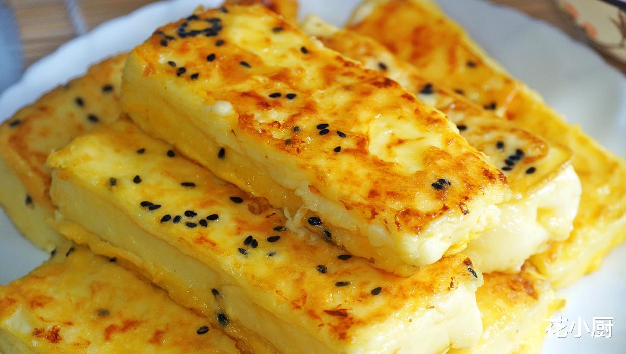 6、然后煎一煎,平底锅、电饼铛都可以,小火慢慢煎,然后翻一翻,都煎成这种金黄色,软软的就可以,吃起来很香的,和烤牛奶差不多,但不需要烤箱,会更简单一些;
