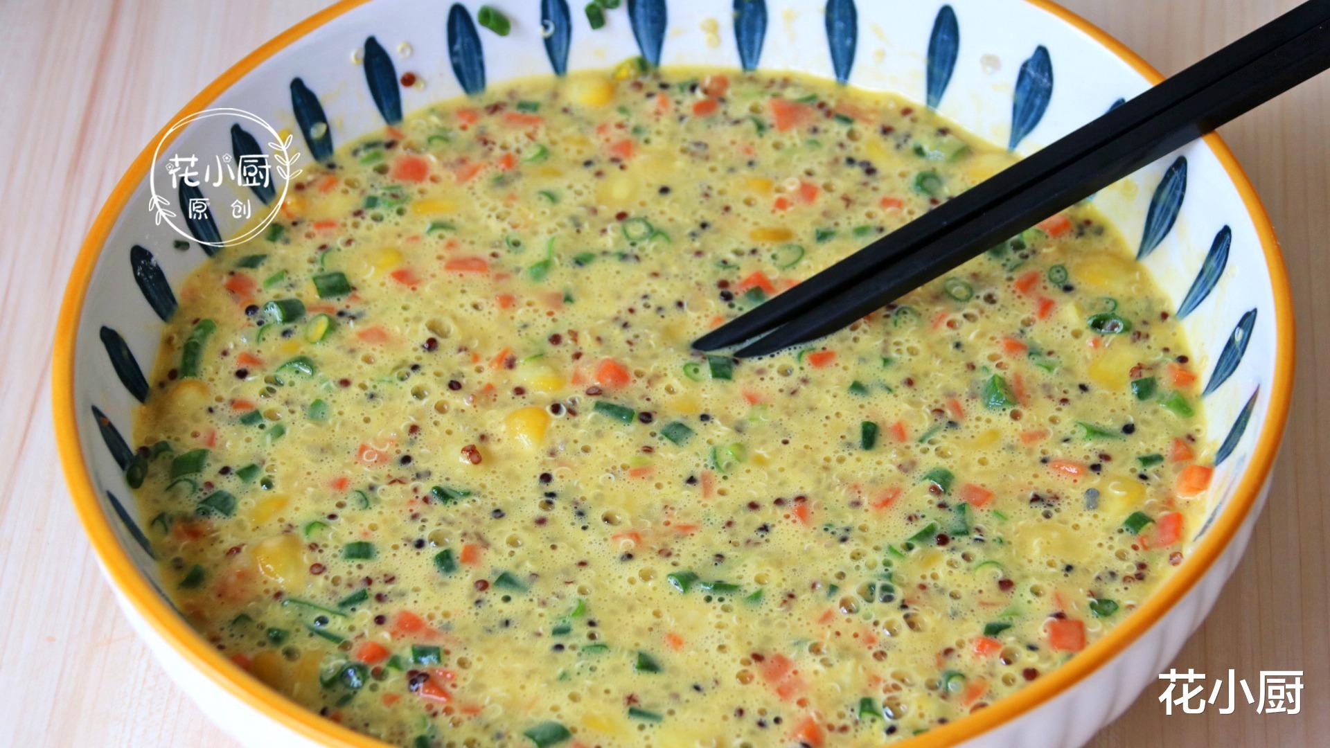 食材:半碗藜麦、半根玉米、半根胡萝卜、3个鸡蛋、一把小葱、普通面粉、牛奶、盐、胡椒粉、十三香、油