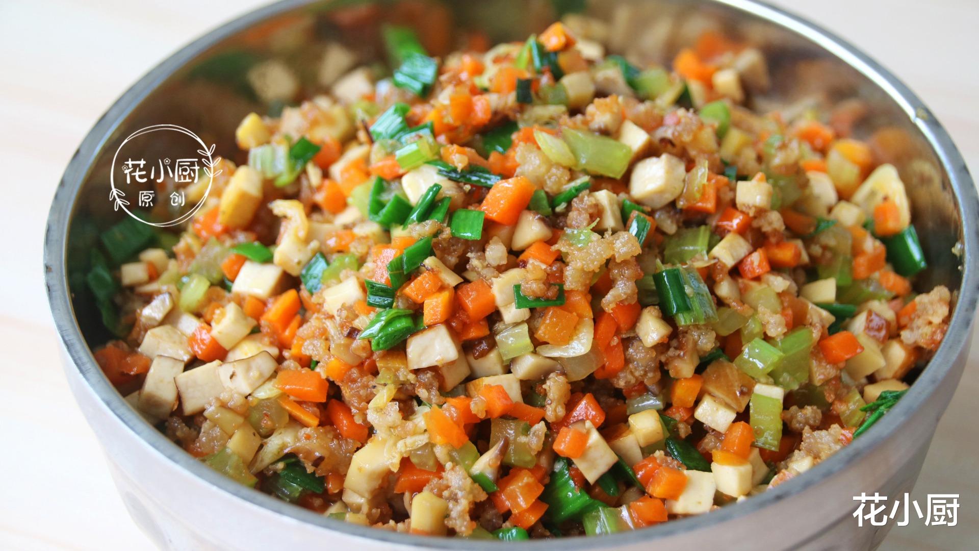 3、锅中热油,油热倒入肉沫,炒出肉香味和多余的油脂,呈现微黄的时候,加入生抽调味,接着倒入香菇丁、豆腐丁、胡萝卜丁、芹菜丁,炒至断生后调味加盐、白糖、五香粉、鸡精,炒至所有食材入味,最后加入一把虾皮、蒜叶,炒匀后就可以出锅了;