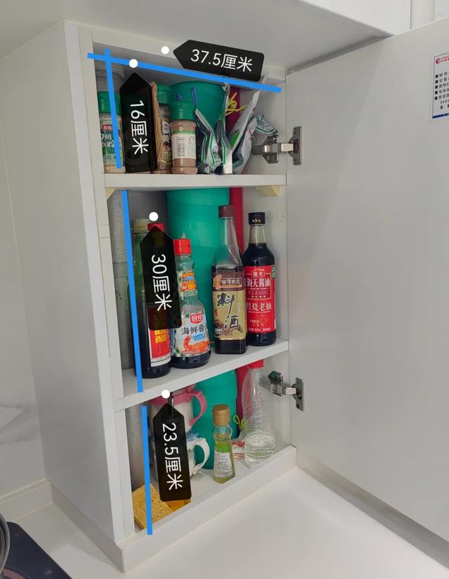 调料柜最高要留 30 公分,最低也得15 公分,深度是 25 公分,这个尺寸能放各种大小的调料瓶,让调料有专门的地方放。