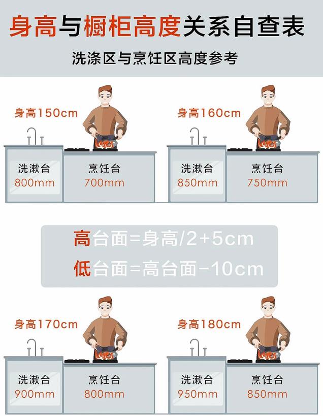 要是地柜高度不合适,切菜洗菜的时候得弯腰弓背,炒菜的时候又得架着胳膊,时间长了,那可累得不行。