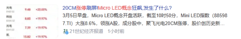 受此利好影响,MicroLED概念掀起了涨停潮,A股涨幅榜前列大多数席位被“光电”包揽,包括龙腾光电、聚灿光电、华灿光电在内的16股涨停。