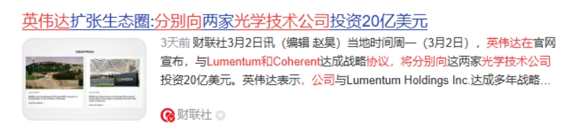 3月3日英伟达发布公告称,公司将在多年期协议中向光学技术公司Lumentum和Coherent分别投资20亿美元。英伟达与Coherent的非独家协议包括数十亿美元的采购承诺以及未来先进激光组件的产能使用权,同时,英伟达将支持Lumentum的研发、未来产能和运营,助力其在美国新建晶圆厂。