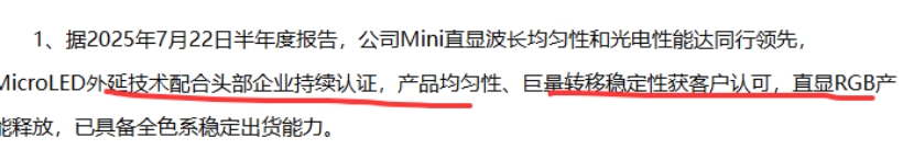 Micro LED光互联:公司Mini直显波长均匀性和光电性能达同行领先,Micro LED外延技术配合头部企业持续认证,产品均匀性、巨量转移稳定性获客户认可,直显RGB产能释放,已具备全色系稳定出货能力。