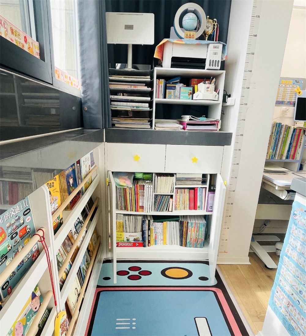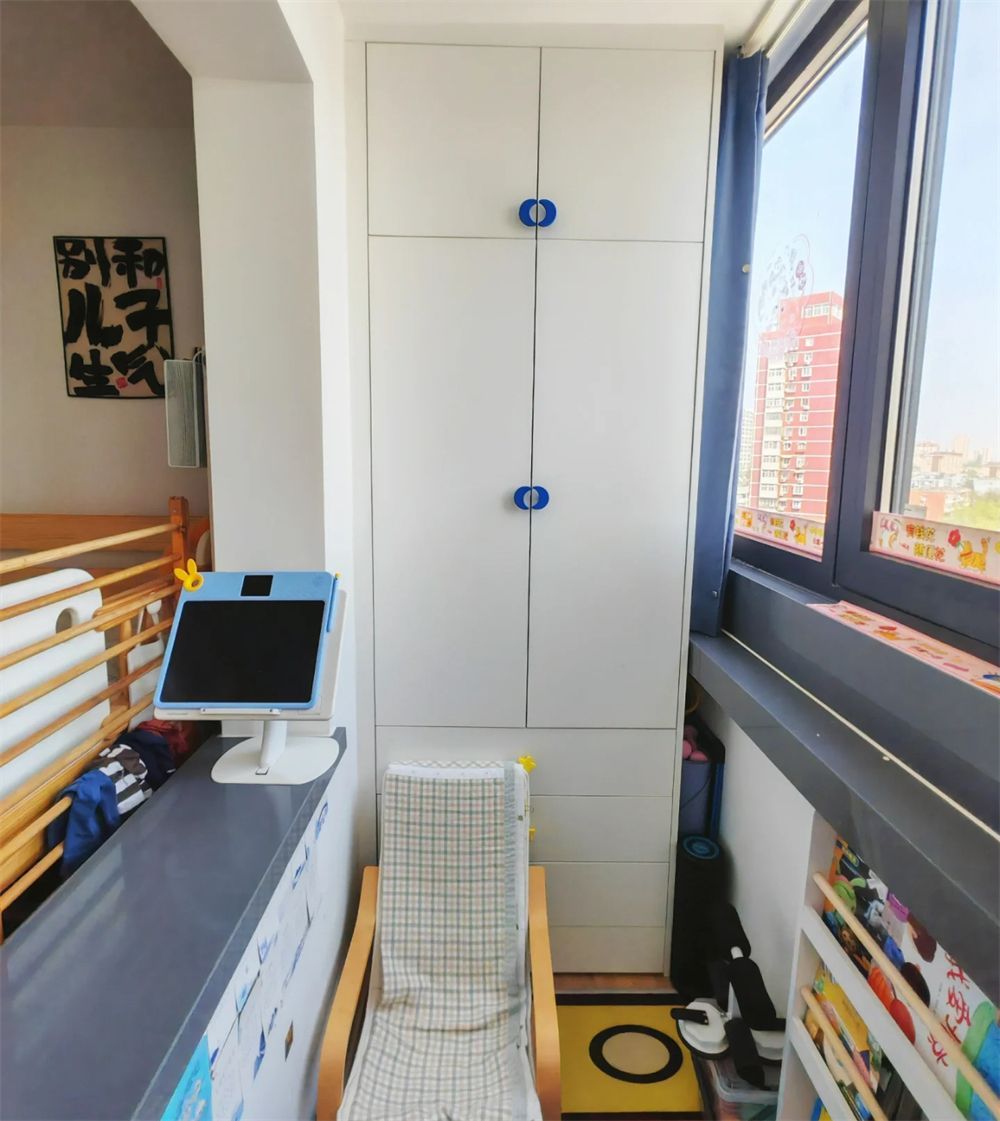 最后说说家里的阳台,阳台连着次卧室,被夫妻俩做成了儿童房衣柜和孩子的阅读区。