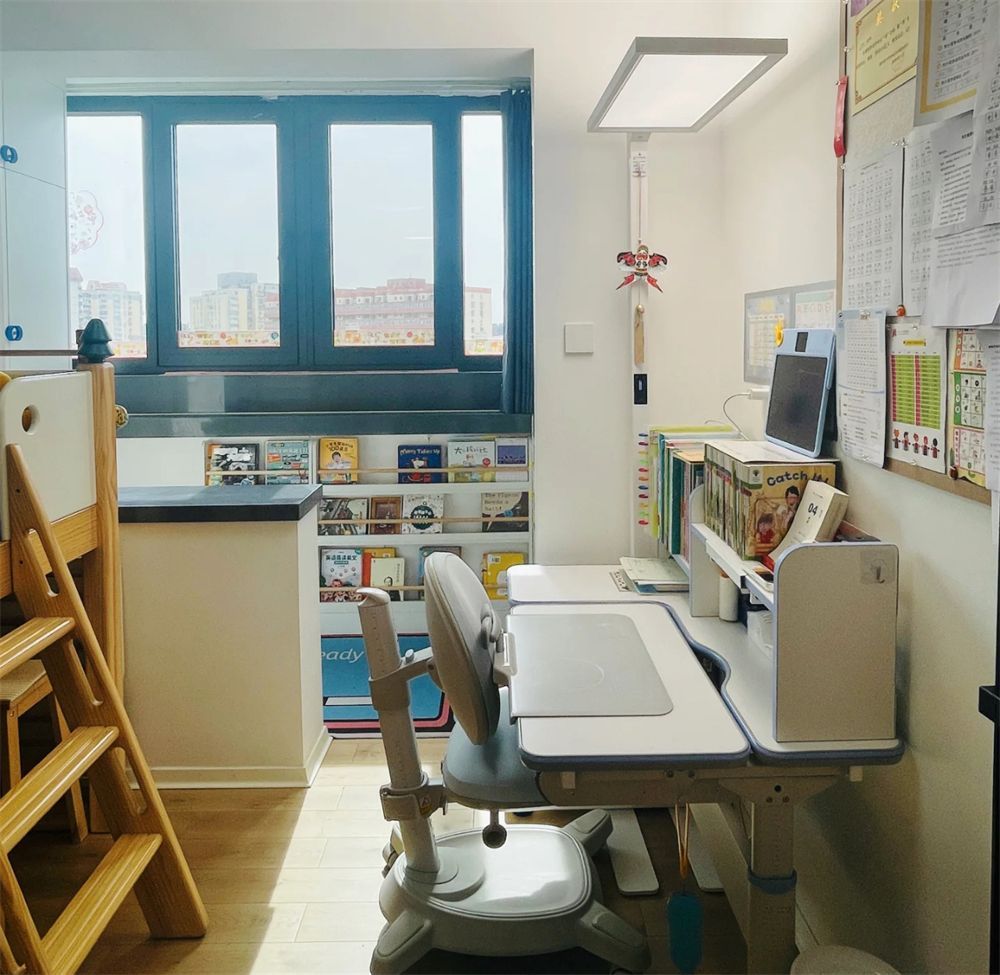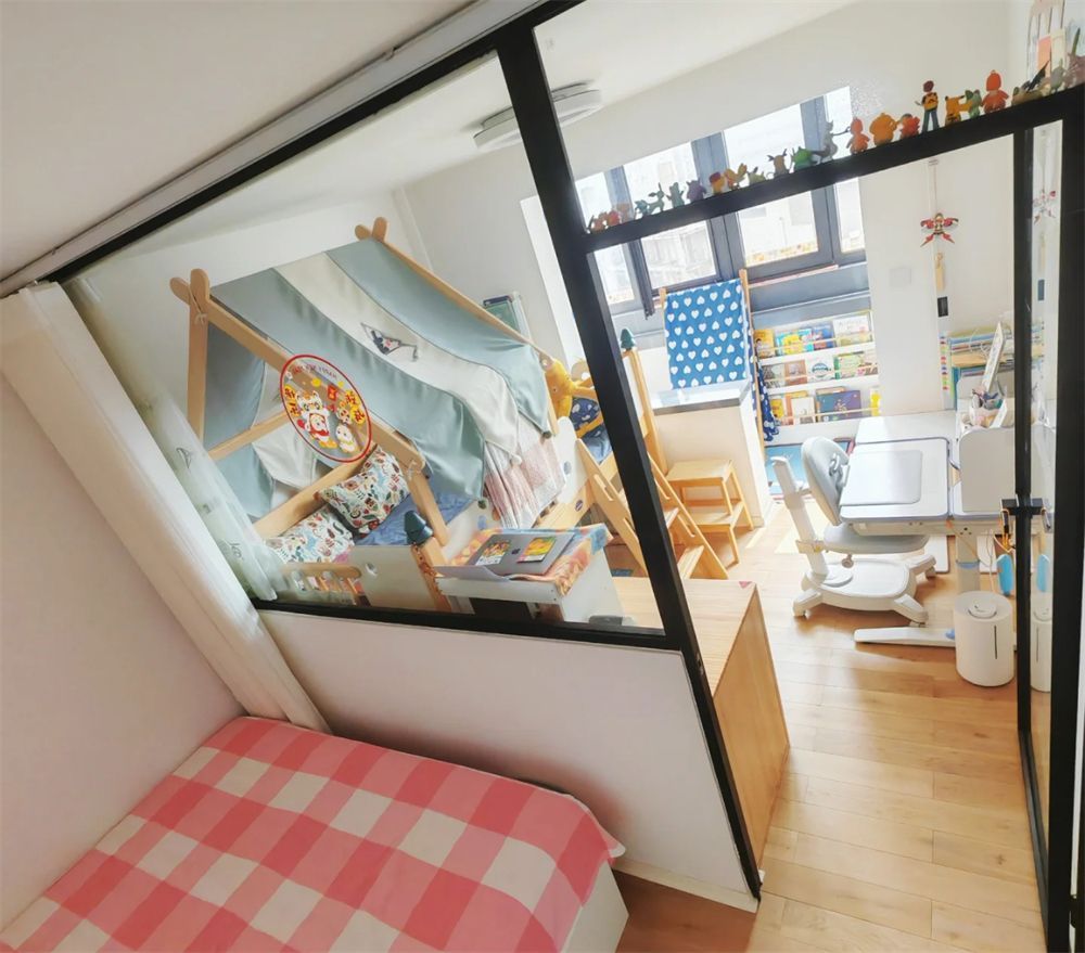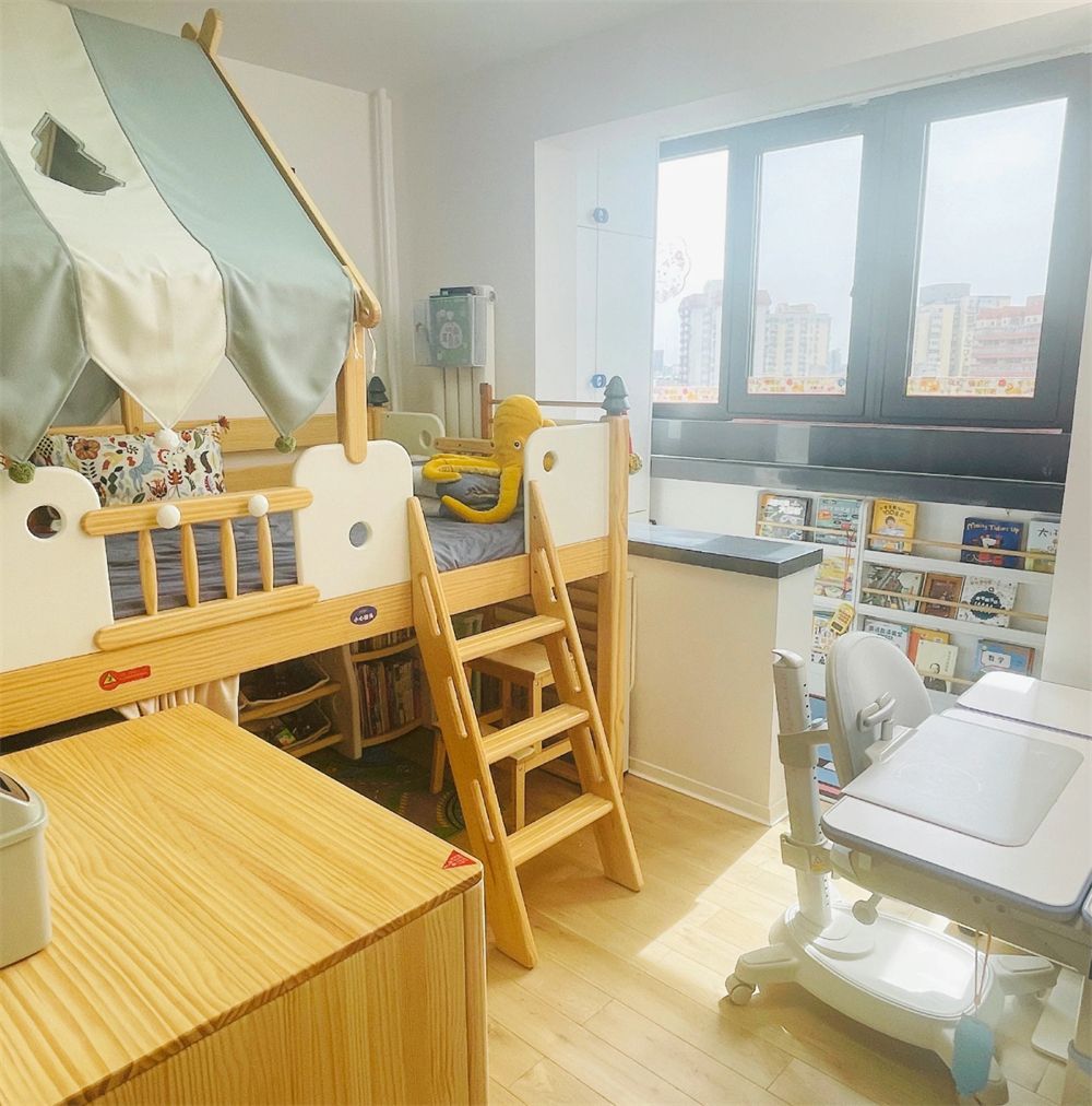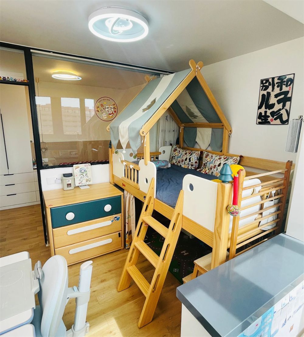 虽说家里只有寥寥26㎡,但夫妻俩还是把采光最好、最宽敞的一处卧室留给了孩子,一边放矮上铺床,一边放学习桌,兼顾休息玩乐和学习。