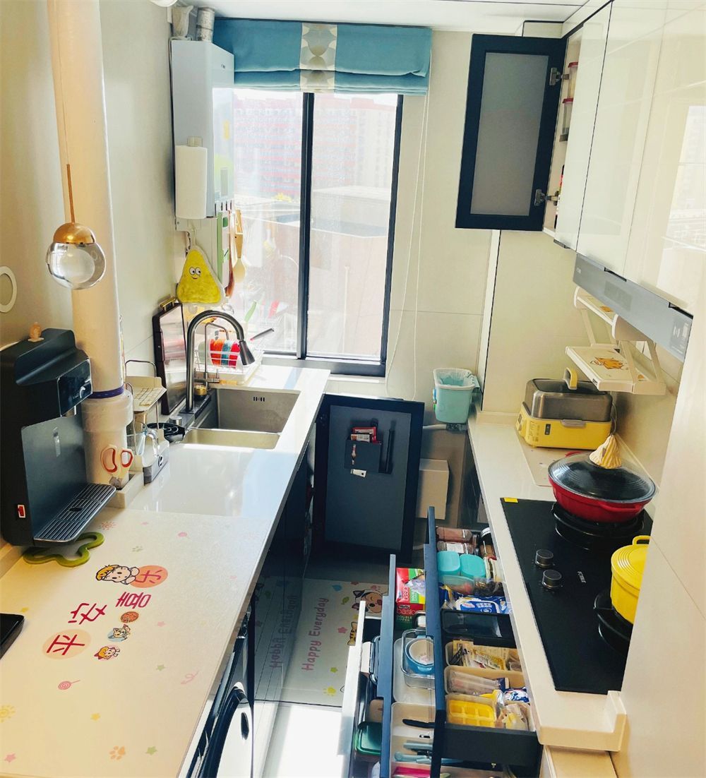 右边是没做门扇的半开放式厨房,虽说较为窄小,只能容纳一个人用餐,但好在柜子做得多,嵌入收纳各种杂物也不会显得太乱。