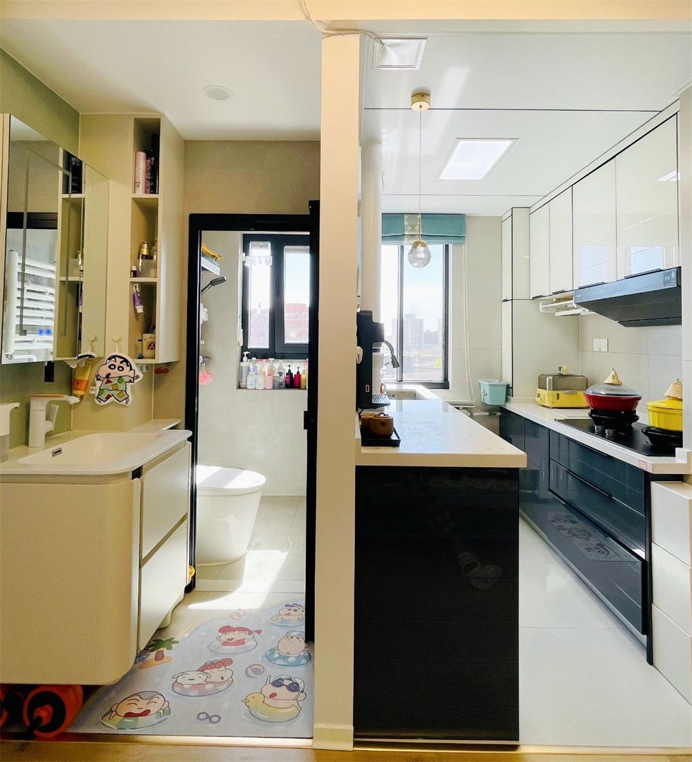 正对沙发的位置,空间一分为二,左侧是干湿分离的卫生间,洗手池外移,定制了薄洗手柜,留出通向里面如厕洗漱区的动线空间。