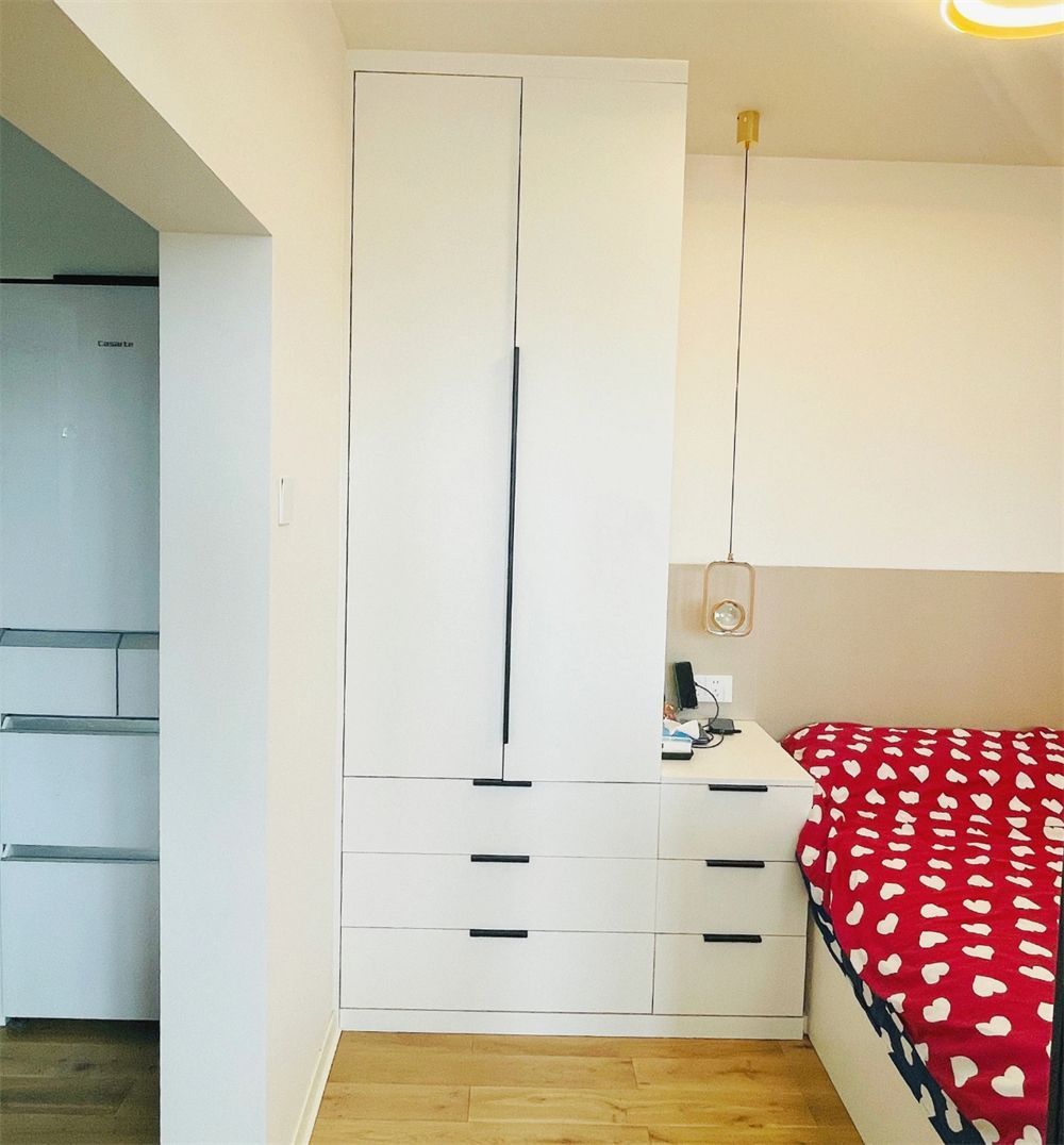 床头这组通顶式定制柜,可以说是卧室中的点睛之笔了,不仅在靠墙处做出了衣柜挂衣区和抽屉柜,还延伸出来了一个小小的床头柜,方便晚上睡觉之前放水杯、手机和书本等物。