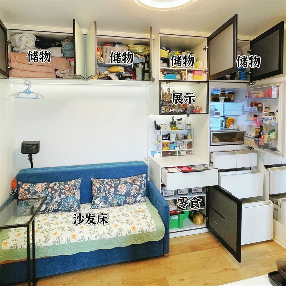 围绕着它,做出了一整圈的定制柜,就连分别用来展示、收纳杂物和零食,甚至连冰箱也嵌入柜体内,一体感极强。