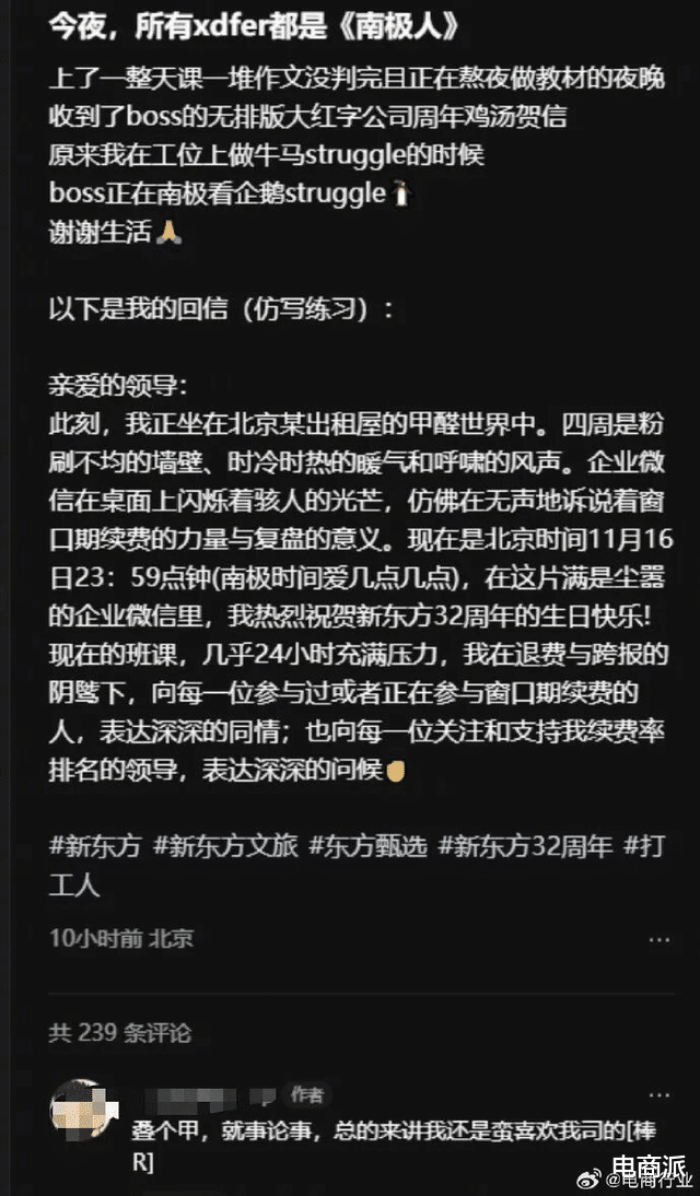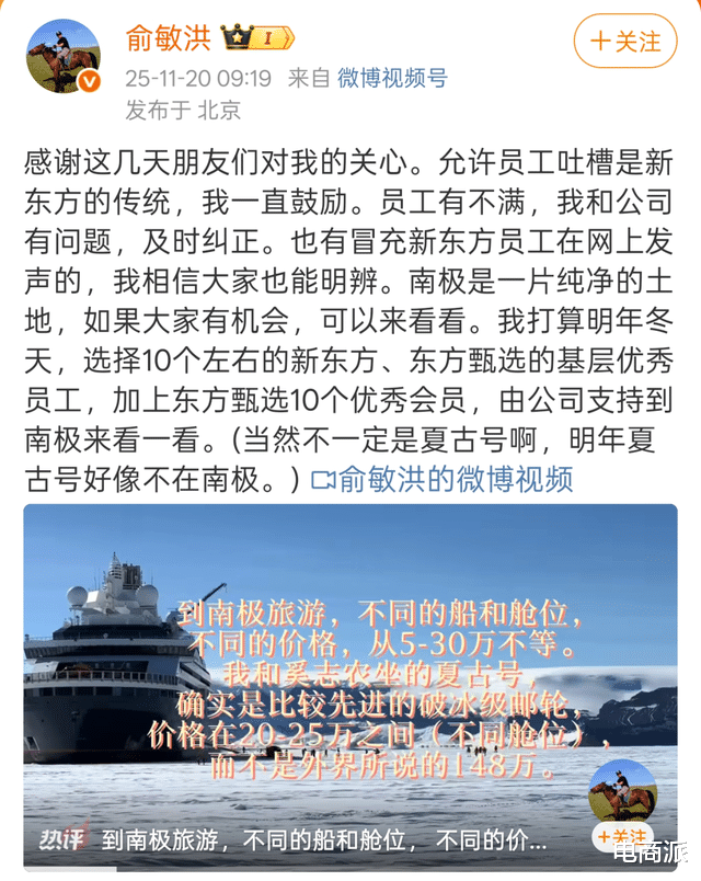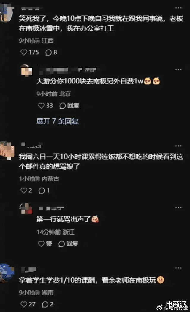 具体而言,这场风波的核心争议主要指向俞敏洪“踩在”员工的血汗之上,大肆炫耀自己的旅游生活。当员工们在公司高强度加班加点时,在高压的工作节奏中奋力前行时,迎来的却是俞敏洪的“我在南极看世界”的分享。这种强烈的反差,让信中的感谢显得有些轻飘,甚至被解读为一种“何不食肉糜”的隔阂。