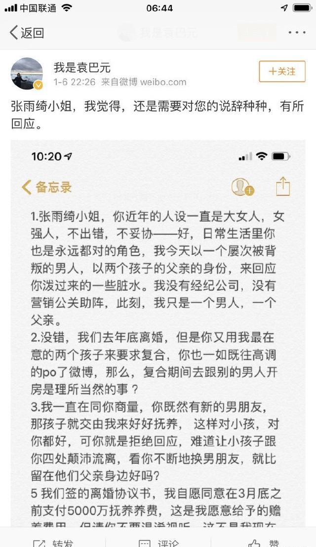 袁巴元的发文开启夸夸模式,夸赞张雨绮非常照顾孩子和顾家,不存在出轨。