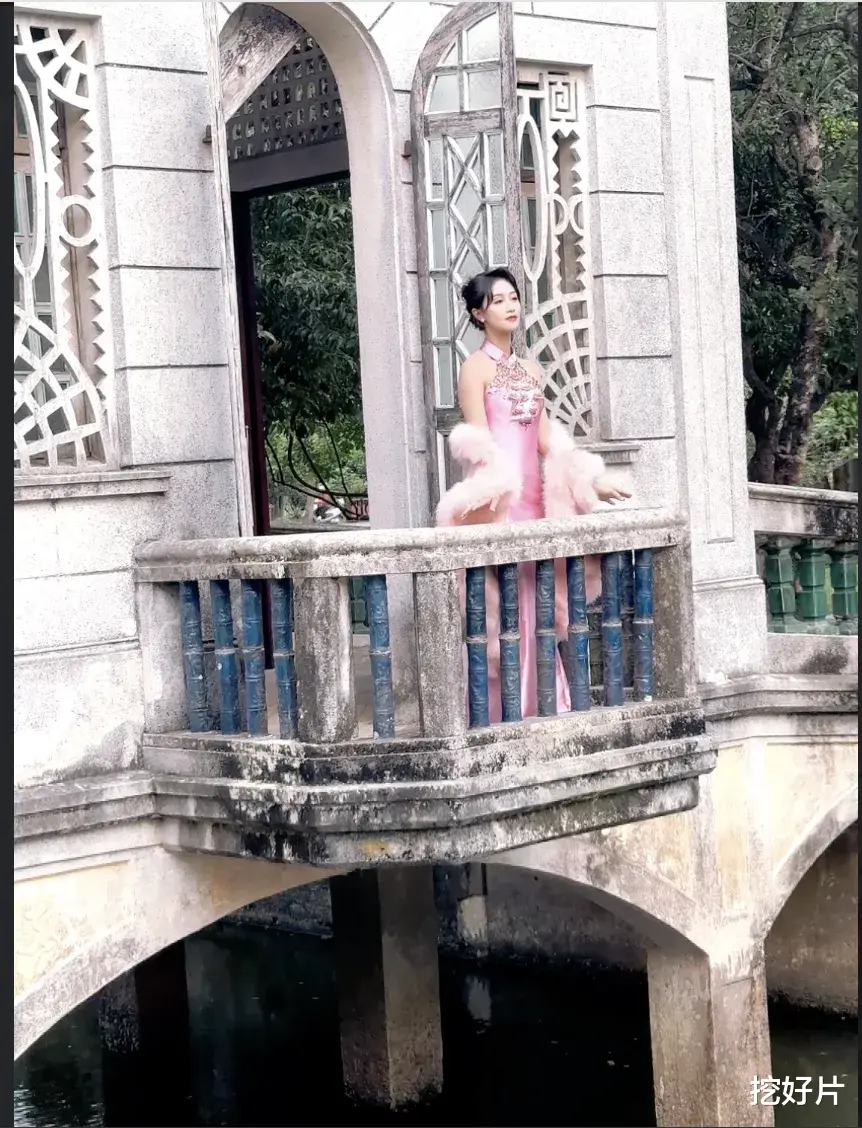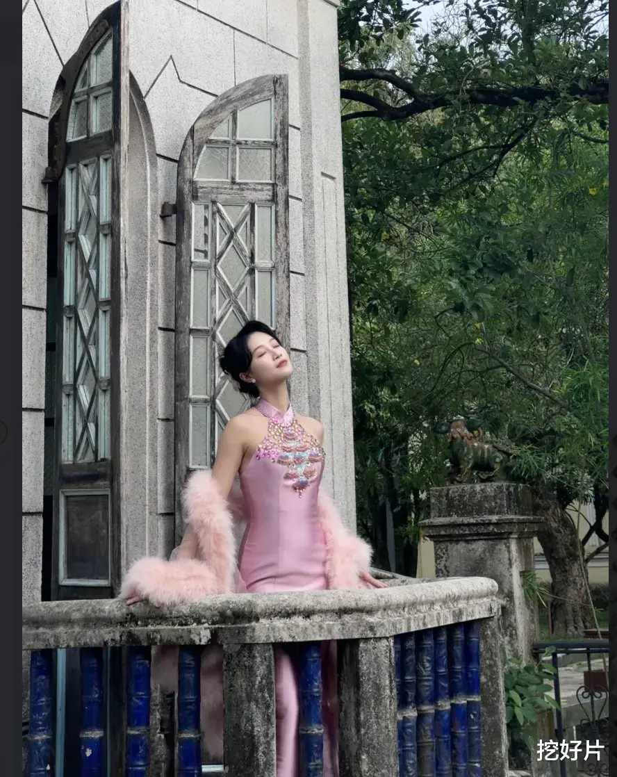 她优雅地登上楼梯,望着远方,还有一种民国风美人的感觉,蓝盈莹的皮肤很白,身材曼妙优雅,各种颜色都能够信手拈来。