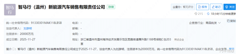 援引包括盖世汽车在内的多家媒体报道,智马行(温州)新能源汽车销售有限责任公司于近日成立,法定代表人为刘彦明,注册资本为2亿元人民币,经营范围包括新能源汽车整车销售、新能源汽车电附件销售、新能源汽车换电设施销售、汽车销售等。