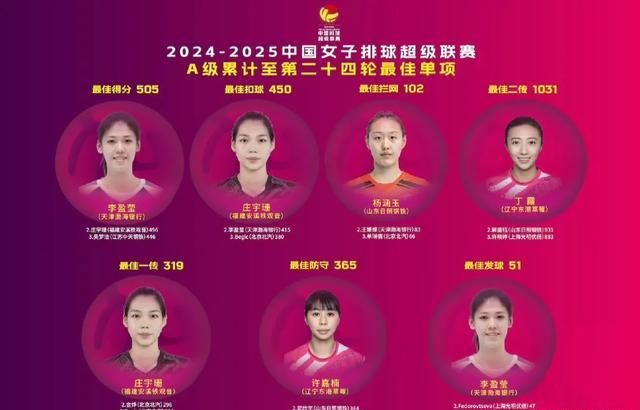 女排A级累计至第二十四轮最佳单项技术具体情况如下: