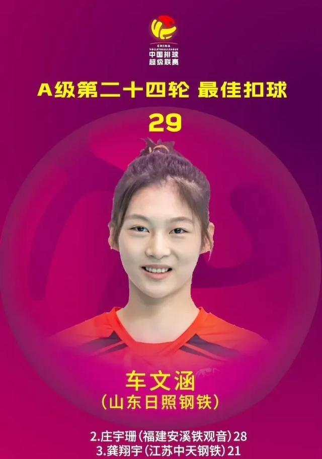 2024-2025中国女排超级联赛A级季后赛F组(5-8),山东日照钢铁3-1(25-21 21-25 25-20 25-20)力克福建安溪铁观音,福建女排主攻庄宇珊获得全场最高的31分(60扣28中3失误1被拦、3拦),成为这一轮最佳得分手。山东女排主攻车文涵获得队内最高的29分(66扣29中0失误3被拦),66扣29中成为这一轮最佳扣球手。